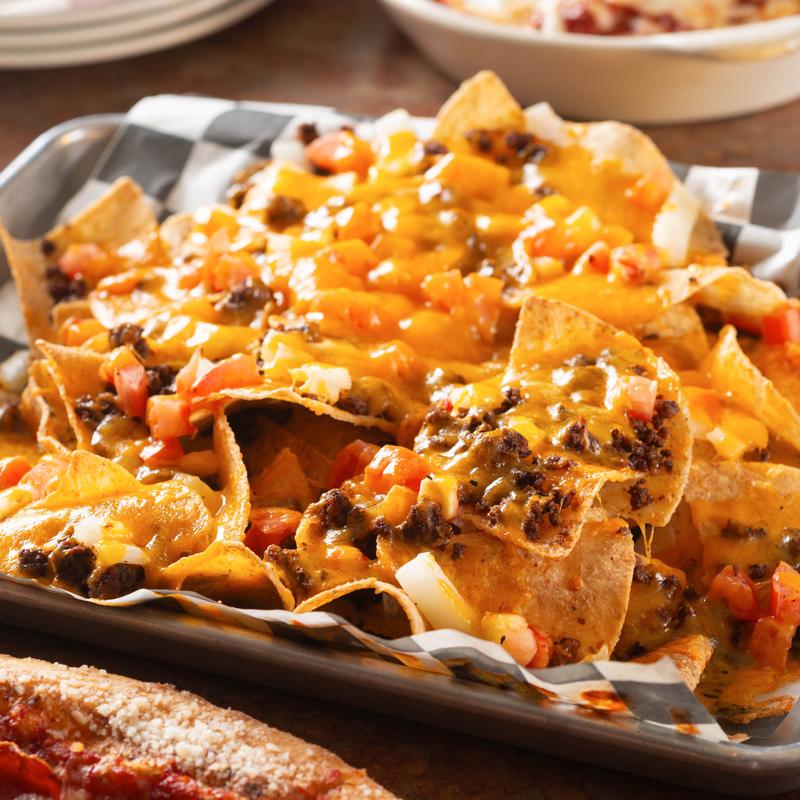 Crispy chips piled with taco meat, lettuce, chopped tomatoes, onions, and plenty of cheese.
