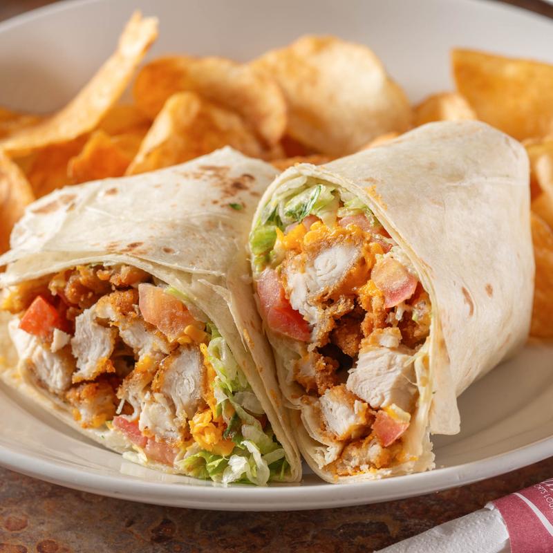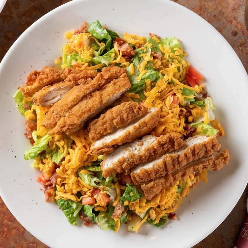 Chicken tenders or grilled chicken on a bed of romaine, served with bacon, diced tomatoes, Colby cheese blend.