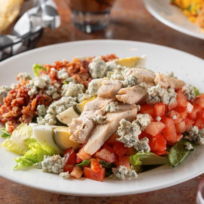 Fresh garden greens topped with bacon, Gorgonzola, hard-boiled eggs, tomatoes, and grilled chicken breast.