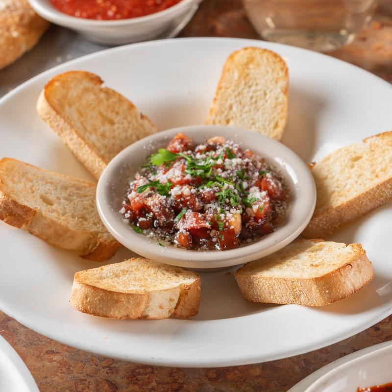 Diced tomatoes, fresh garlic, tossed in olive oil and balsamic vinegar. Topped with Romano cheese and served on top of baked French bread.